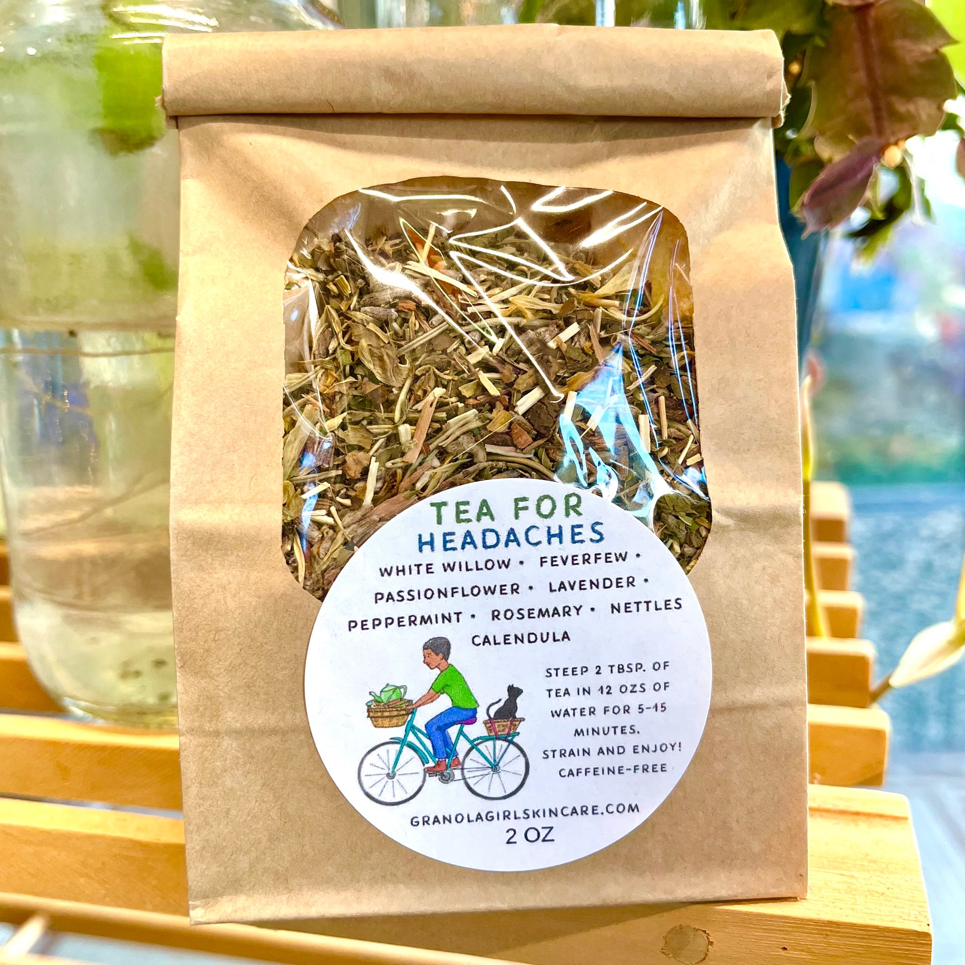 Tea for Headaches contains feverfew, white willow, peppermint, rosemary, nettles, lavender, calendula. 2 oz tea blend.